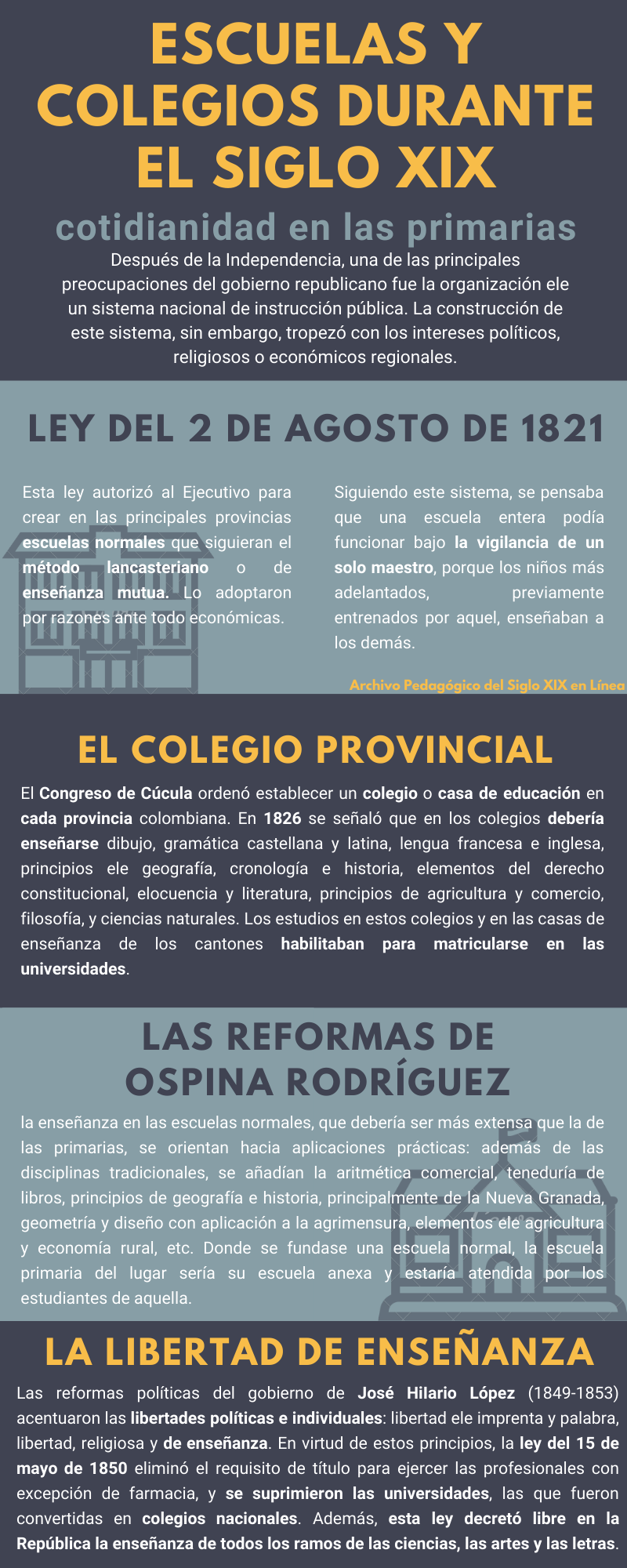 El contenido hipermedial permite dar cuenta de la cotidianidad de las escuelas primarias públicas colombianas de finales del siglo XIX a partir de los informes elaborados por los inspectores de instrucción pública; a través de ellos podemos conocer las prácticas de exámenes escolares como eventos de ciudad, asistencia, asignaturas que se enseñan, presupuestos, etc., empleando como categoría de análisis la práctica pedagógica.