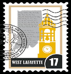 My stamp design showcases my journey at Purdue University. I joined in 2017 and the first thing I learned is the "Hail Purdue" song. The Bell Tower (in gold) is one of the famous landmarks on campus and has a tradition where students must not walk under the tower otherwise they won't graduate in 4 years. Purdue is located in the state of Indiana (in gray) and I added the seal of the state to the left with the lyrics to the "Hail Purdue" song on top.
