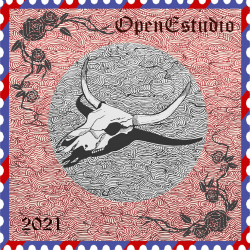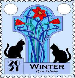 For my print I chose several elements that represent me as an artist and person, among them is Art Nouveau, cats, detailed and ornate constructions, I also used words like Winter and Open Estudio to express projects and times that I like. // For my stamp i chose several elements that represent me as an artist and person, some of them are Art Nouveau, cats, detail constructions and ornamented. Also i used words as Winter and Open Study to express, projects and seasons that i like.