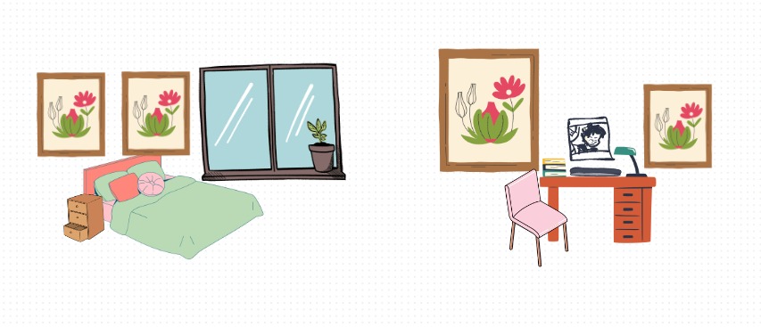 The cork board, hanging pots, monstera plant, bookshleves, and the cat are my touch. They all give me a comforting feeling."