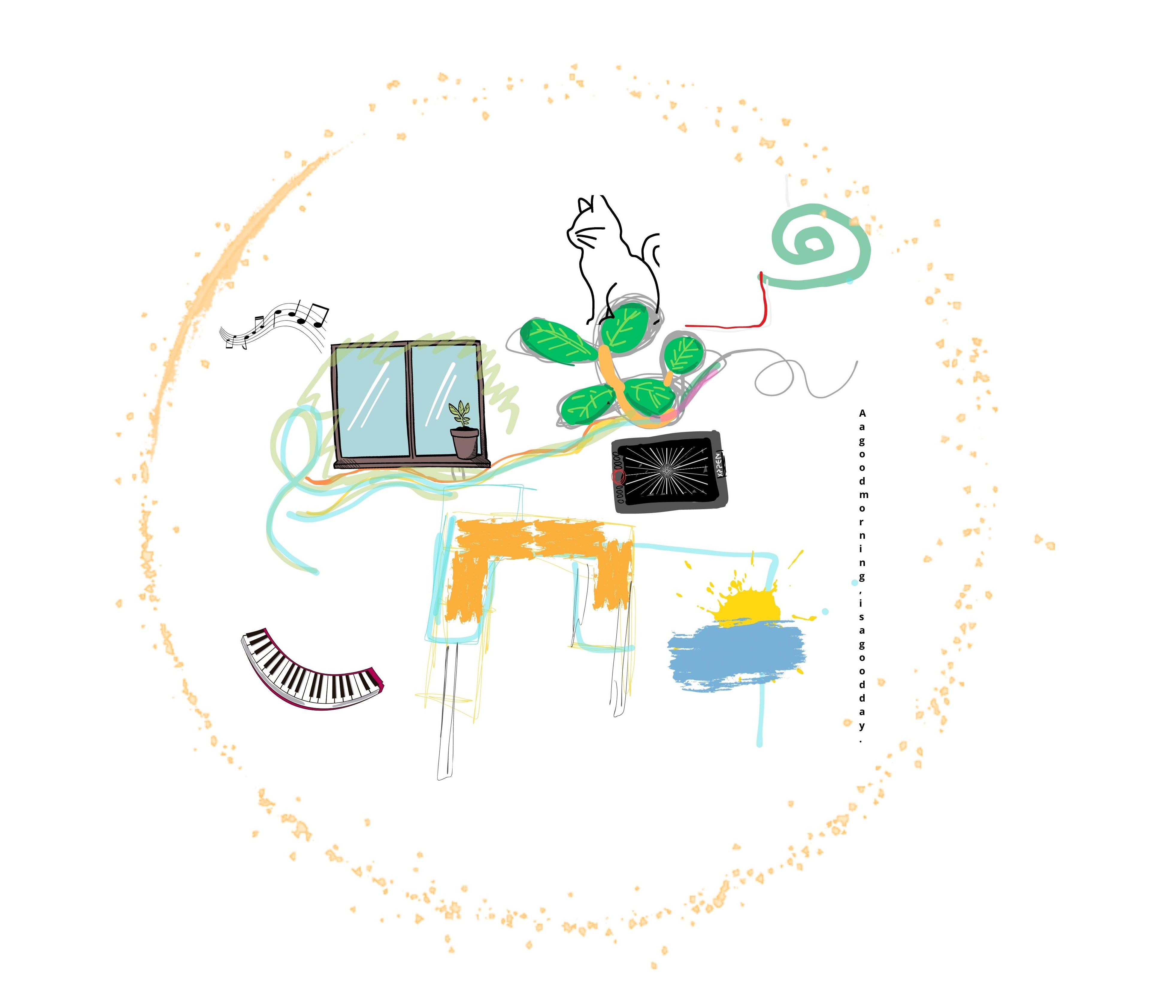 "En mi habitación no puede faltar el piano para hacer y crear música, la guitarra y el computador fue una herramienta en común entre todos los compañeros. mi gata siempre esta conmigo ayudándome a continuar y a realizar pausas activas en los procesos creativos."