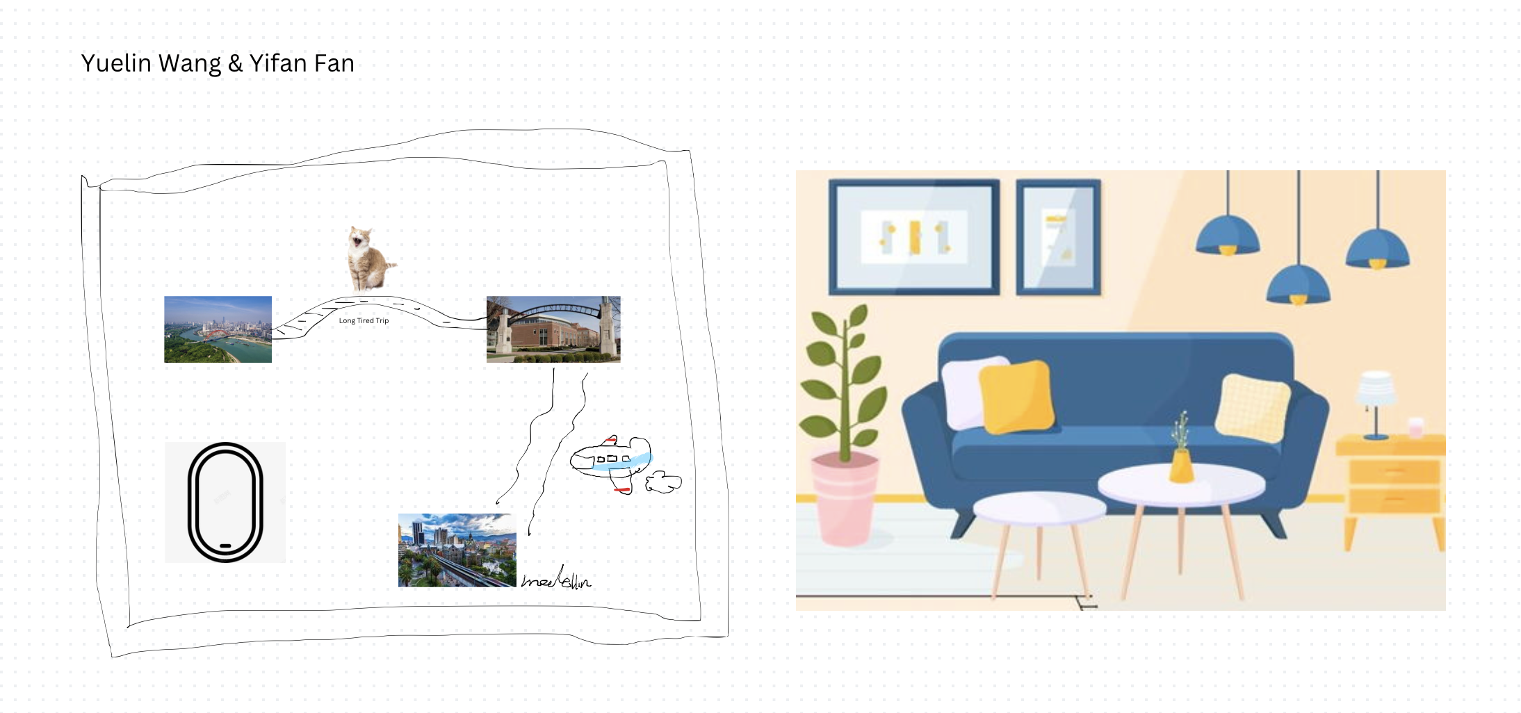 "This was the first group activity we did for this class. Even though there was a large language barrier in our group, we used Google Translate to communicate and figure out what to draw. I drew the chair and table because in my major, I am constantly sitting at a desk working, and I drew the piano because there was one near me at the time and I love music. I also added the flowers and the sunset because I love nature and I wanted to add some color to our map."